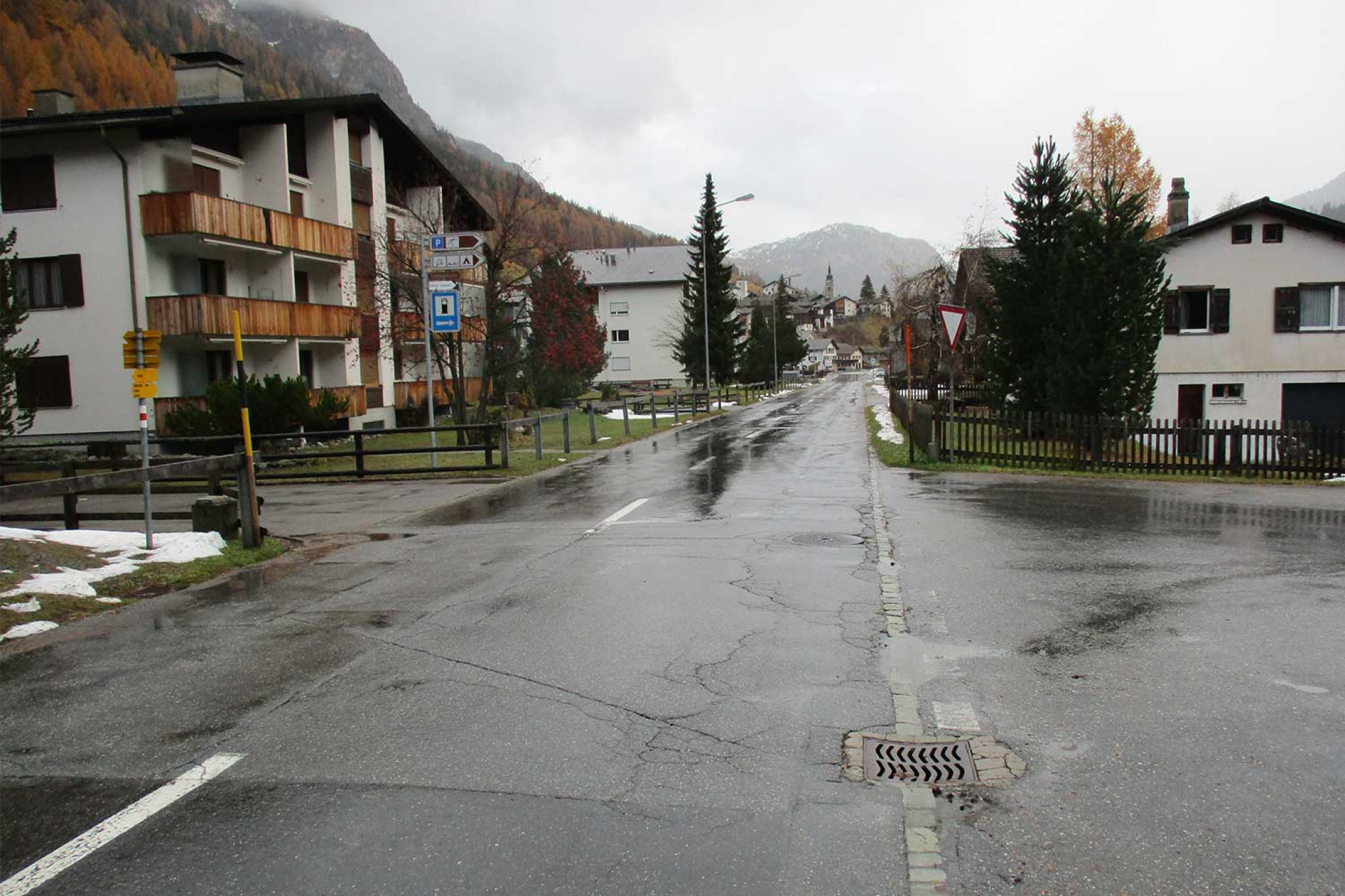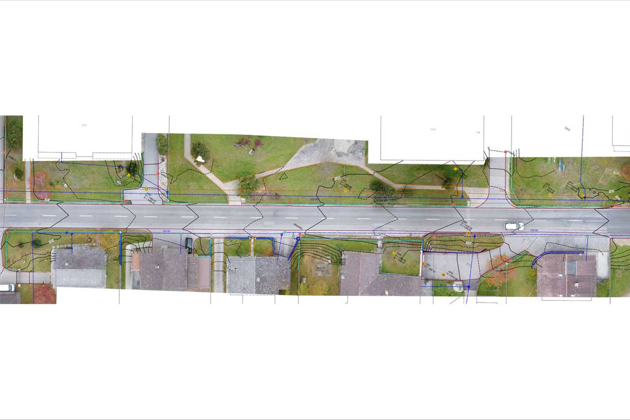 Im Auftrag des Tiefbauamtes des Kantons Graubünden konnte die HMQ AG für die anstehende Sanierung der Italienischen Strasse in Splügen die Projektierungsgrundlagen erstellen. Im bebauten Gebiet erfolgten die Aufnahmen mit dem Tachymeter im Ein-Mann-Betrieb. Ausserorts wurde der Strassenraum mit der Drohne beflogen. Aus den Fotos wurde zusätzlich ein hochauflösendes Orthofoto gerechnet. Aus den Tachymeteraufnahmen wurde ein digitales Geländemodell generiert und auf dem Situationsplan dargestellt.